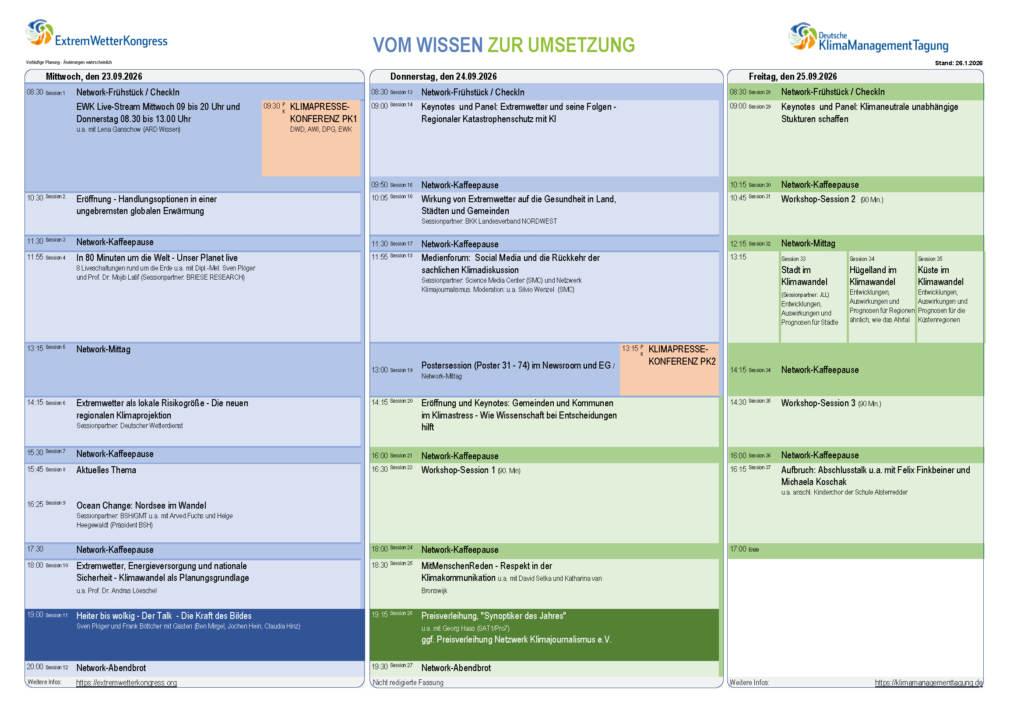 Unmittelbar vor der Deutschen KlimaManagementTagung findet am gleichen Ort der 16. ExtremWetterKongress statt. Die Veranstaltungen sind gemeinsam oder getrennt buchbar. Ziel der Kombination ist die Stärkung der Verbindung aus WISSEN und UMSETZUNG. Weitere Informationen finden Sie hier: